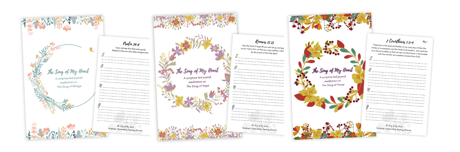 In this 3-part series, each journal guides you through 30 days of scripture focusing on one of these three truths. You are encouraged to write, think, and pray on God’s word while applying the acronym SONG for each verse: Scripture, Observation, Nesting, and Growth.